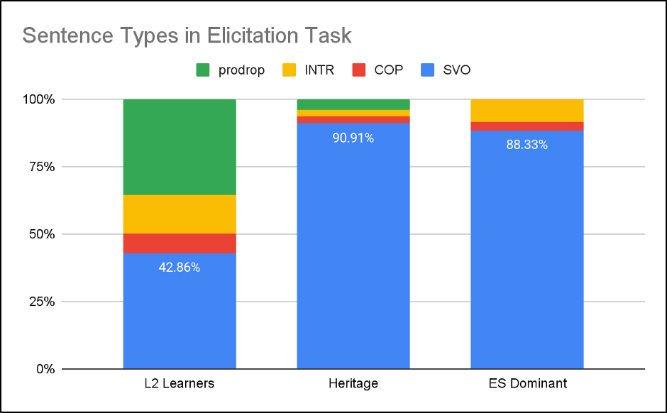 These tasks measure syntactic language transfer. Groups that were less accepting of non-SVO word orders show the most language transfer. The elicitation test was designed with the idea that groups with less language transfer would use more varying word order. On the judgment task, more language transfer would mean accepting more of the sentences as correct. We expected differences in the amount of language transfer between the groups with ES-dominant speakers demonstrating the least language speakers, meaning that we expected they would use and accept more non-SVO word orders. Based on the previous research, we also believed that L2 learners would show the most language transfer by relying on English syntactic cues to have narrower use and acceptance of word order. Heritage speakers were expected to fall in the middle.