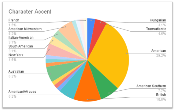 Referencing Figure 1 which provides a visual representation of the distribution of the observed character accents, we were able to establish four distinct results. Firstly, we found that the protagonist(s) of the films indeed were associated with the American Standard English accent 54% of the time. Furthermore, 100% of the protagonists had European or American accents — in other words, no minority population accents were represented in the protagonists of these films.