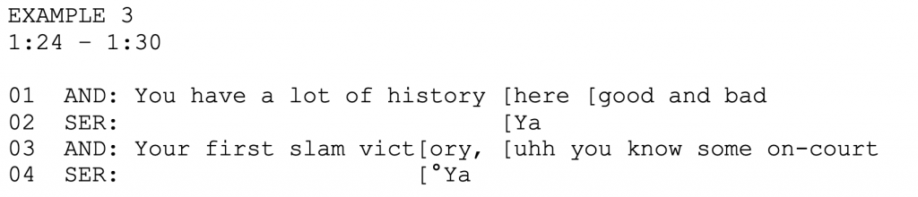 In line 2, Serena interjects Roddick’s speech with a reassuring “Ya,” but Roddick then continues to talk, similar to the conversation documented in example 2. In line 4, Serena also interjects with a “Ya.” In both instances, as she speaks, Serena nods her head up and down and orients her body towards Roddick, illustrating the role that her body language plays in physically showing Roddick that she is comfortable in the conversation.
