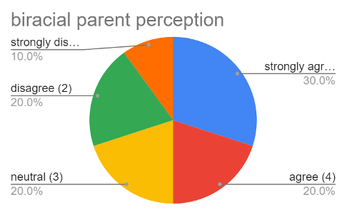 Although both monoracial and biracial students thought their parents had generally positive views towards bilingualism, the monoracial students agreed more strongly than the biracial students. The monoracial students picked “strongly” agree over 50% of the time, whereas the biracial students only picked that 30% of the time. Monoracial students also agreed (ranking either 4 or 5) with the positive statements over 70% of the time whereas the biracial students only ranked the statements 4 or 5 50% of the time. Although this is merely a correlation, it is an interesting observation to note that could lead to more studies in the future.